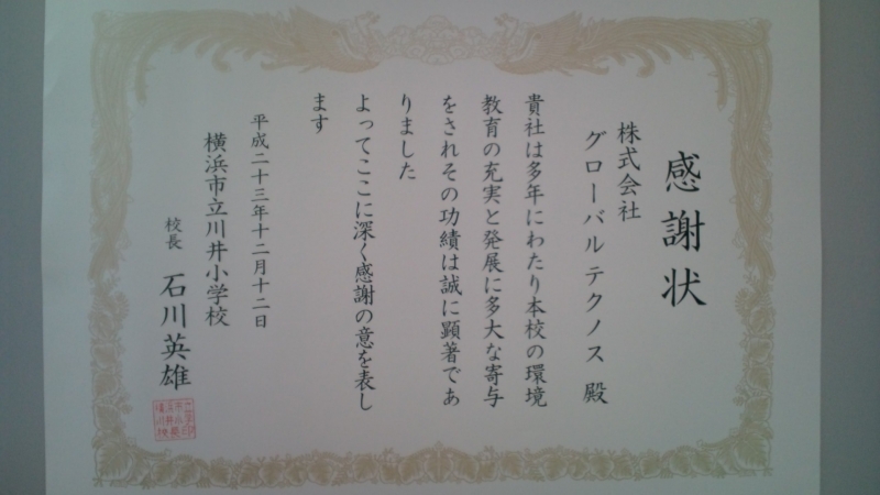◎横浜市立川井小学校より、感謝状を戴きました。