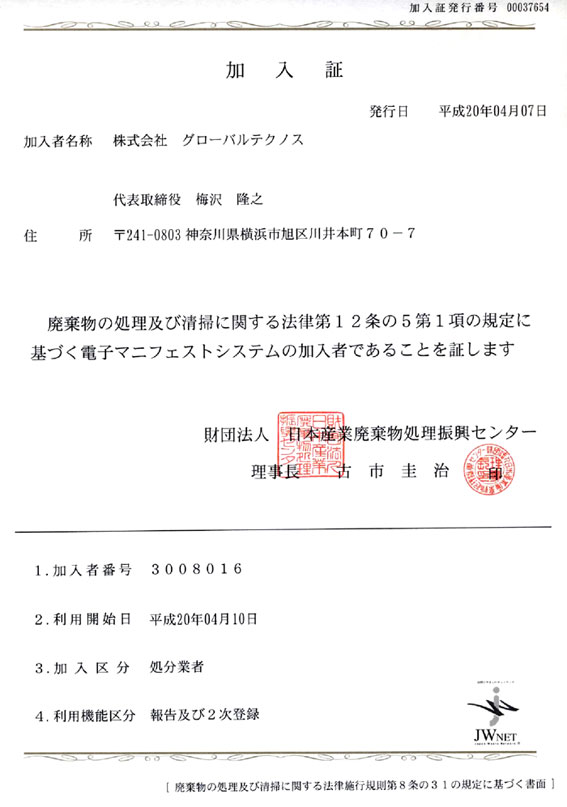 弊社ではマニフェストを発行するにあたり、より安全で円滑、且つ正確な情報管理で皆様に安心して頂くために、電子マニフェストの対応を開始致しました。